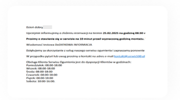 To Ty możesz wpłynąć na swój komfort pracy w sezonie! Informując klientów o nadchodzącym okresie wymiany opon i dostępnych promocjach, zyskujesz lepszą kontrolę nad organizacją pracy - to mniejsze ryzyko opóźnień i kolejek. Twoi pracownicy mogą się skupić na jakości wykonywanych usług, a klienci otrzymują sprawnie przygotowane auto. Konsumenci natomiast docenią możliwość wygodnego wyboru terminu, co zwiększa ich satysfakcję i lojalność. Zadowoleni chętnie polecą Twój warsztat jako profesjonalny i godny zaufania serwis.